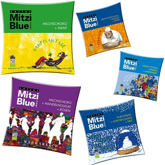 Zotter | Mitzi Blue - Zestaw 5x czekolada - Hemp Plantation, Marrakesh, Gingerbread, Heaven of Love, Softly Falls the Snow | ORGANIC - FAIR TRADE